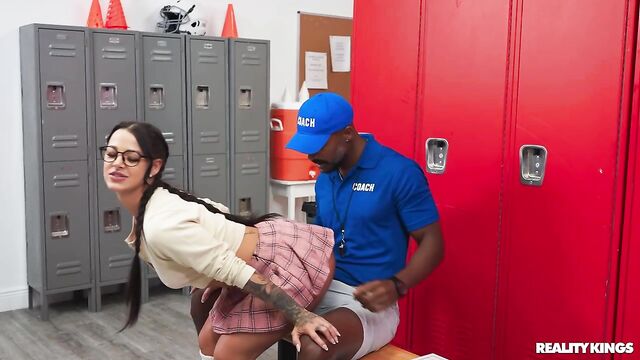 Description:Horny college nerd Evelin Stone picks her moment to sneak into the men's locker room, and immediately hits the motherlode: a hamper full of sweaty shorts to sniff! When the coach and players come in, Evelin hides in a locker, but gets caught by coach Dickdealer Don. Evelyn butters him up and soon is sitting on his lap and getting her tits squeezed and played with as she grinds on his dick. The hot coach stretches out her pussy and tries to stay quiet while she sucks him behind the players' backs. Evelin rides him on the floor and takes the coach's load on her glasses.
