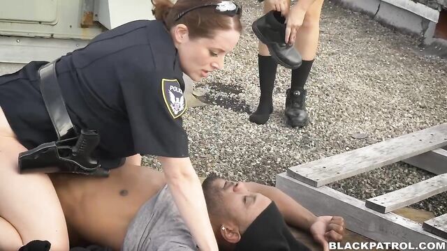 Description:We got a call. A break in at the industrial office complex on Mainland and 3rd. We arrived on the scene and found that the back door was open so we entered and began inspecting the scene. We found the suspect in the back of the offices, he has two computer screens on his hands and he looked to be stealing them. We told him to freeze but the suspect ran into a back room and out some hallways. We gave chase and the suspect led us to the roof of the complex. We knew we had him cornered, so we split up and began scanning the roof. We found the suspect hiding behind some A/C units and we made an arrest. After we subdued the suspect. We patted him down and we found out that he had a big black dick. So we now know that he was armed, we had to inspect him thoroughly with our mouths. We sucked his dick and saw that his weapon was dangerous. So had to take him down and fuck that dick in order to save situation. Law and order was established when we look a load of his cum.